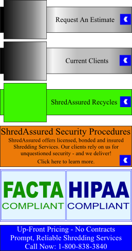 Please click here for more information or give us a call at 1-800-838-3840 to find out how ShredAssured can help your company save money, protect its information, and comply with federal and state laws. Our client specialists are ready to assist and willing to help in any way they can.